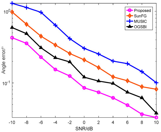 To show the relation between the SNR and angle error, we set the number of snapshots to 500, and changed the SNR from −10 dB to 10 dB with a step of 2 dB, with the other conditions remaining unchanged. A total of 300 Monte Carlo simulation experiments were carried out. Figure 3 shows the simulation results for the relationship between the SNR and angle error.