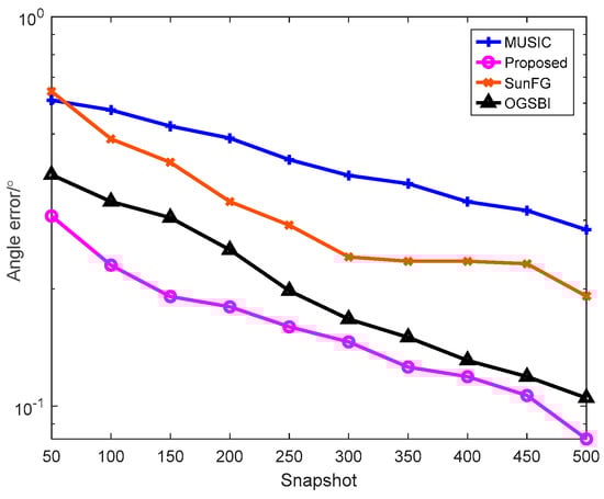 To show the relationship between the snapshots and the angle error, we set the SNR to 10 dB, and changed the snapshots from 50 to 500 with a step of 50, with other conditions remaining the same. A total of 300 Monte Carlo simulation experiments were also carried out. The simulation results regarding the relationship between the snapshots and the angle error are shown in Figure 4.