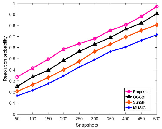 From this figure, it can be seen that the angle resolution capabilities of the four methods mentioned above increase with the increases in the number of snapshots. Moreover, the method proposed in this paper demonstrates a good estimation performance across the entire range of snapshot numbers. When the number of snapshots is 500, the probabilities of successful angle resolution for the four methods are approximately 0.95 (proposed method), 0.89 (OGSBI method), 0.8 (SunFG method), and 0.72 (MUSIC method). The proposed method exhibits higher accuracy in angle resolution compared to the other three methods. Therefore, the experimental results indicate that the proposed method has better DOA estimation resolution than the other three methods.