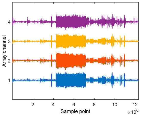 To verify the effectiveness and reliability of the above-mentioned methods in practical applications, we conducted a lake experiment using a fiber-optic hydrophone array. The structure of the coprime array in the lake experiment is shown in Figure 8. The received signal of the fiber-optic hydrophone array is shown in Figure 9. We processed the lake experimental data received by the fiber-optic hydrophone array to verify the resolution performance of the proposed method. During the actual processing, we selected 60,000 valid data points from Figure 9 for analysis. Then, the experimental data were processed using three methods, and the spatial spectrum images of the three methods in the underwater environment are shown in Figure 10. The SunFG method could not successfully estimate the direction of the incident signal in this underwater experiment, so the processing results for this method are not shown in Figure 10.