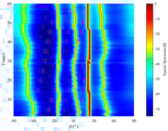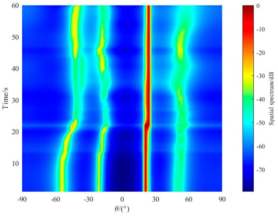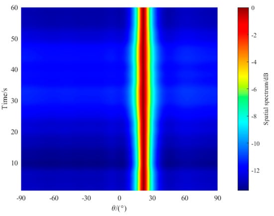 From the bearing time recordings of the above three methods shown in Figure 11 Figure 12 and Figure 13, we can see that all of the methods can obtain a linear course trajectory of the target. Considering the overall effect, the MUSIC method has the widest course trajectory and the worst resolution. The OGSBL method can also estimate a clear trajectory curve, but produces three severely interfering pseudo-peaks, which require pseudo-peak identification and greatly reduce the application of this method in practical engineering. The proposed method can estimate a clear linear trajectory curve, and only generates two pseudo-peaks, and the pseudo-peak value reaches −30 dB, which is better than the OGSBL method. Therefore, the proposed method can obtain the best estimation performance among the three methods.