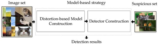 According to the previous discussions, we aim to rely on the model divergence to reveal the sign of guilty actors. When the Warden monitors a public channel, he will collect multiple images. Therefore, the model can be constructed based on the statistical representation of chosen images. Considering the highly complex feature extraction, unlike other pooled steganalysis, we directly calculate the normalized distortion of selected Images, and the model is built based on the obtained distortion set. To show the model difference, we employ the logistic function and LRT to design a new detector through which the appropriate detection results can be obtained. The detailed architecture is shown in Figure 2.