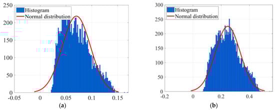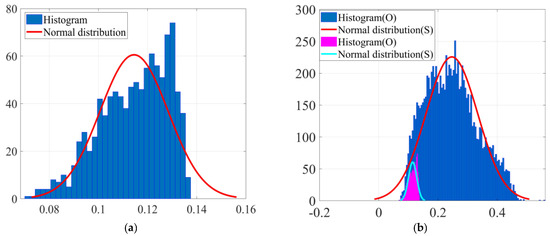 where . In Figure 4a, with a payload of 0.5 and , we provide the fitting result of the selected image set. Clearly, with proper parameters and , the distribution is almost fitted using a normal distribution.