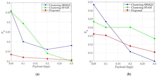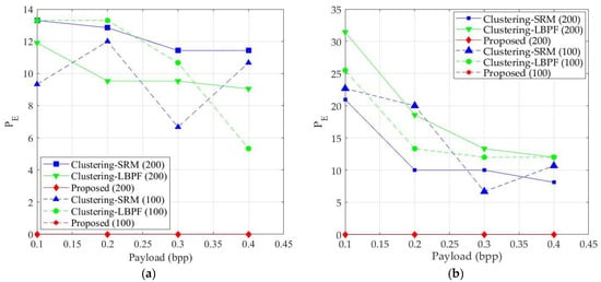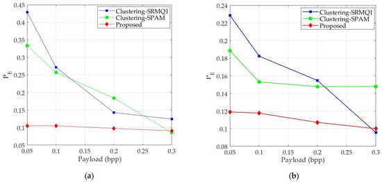 Especially, N and R are set to be 2 and 3. The testing results for two novel batch steganography methods are shown in Figure 5 and Figure 6. Compared with “Clustering-SRMQ1” and “Clustering-SPAM”, the average improvements of the proposed strategy on HILL across four payloads are about 27.34%, 12.71%, 3.75% and 3.46%. For SUNIWARD, the improvements on average are 27.62%, 15.95%, 6.57% and 1.42%. Therefore, our scheme exceeds the clustering-based methods at most cases. Moreover, since we remove the feature extraction, the complexity of our scheme is lower than the that of the comparison methods.