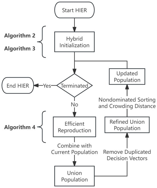The general framework of the proposed HIER algorithm is given by the pseudocode Algorithm 1. The population size N and the feature dimension D are input, while the final optimized population is output after terminating the evolutionary feature selection. In Algorithm 1, the initialization and reproduction processes are, respectively, conducted by Algorithms 2 and 4, which will both be explained later in the following sections. The environmental selection process, which truncates the combination of the previous population and the new offspring into the current population, is almost the same as that in the most well-known traditional dominance-based framework NSGA-II [], except that HIER additionally removes all the duplicated solutions in the decision space beforehand. Moreover, for a better explanation of the methodology, a flow chart for the general framework of HIER is illustrated in Figure 1, where each evolutionary step in Algorithm 1 is presented, along with the invoked algorithms.