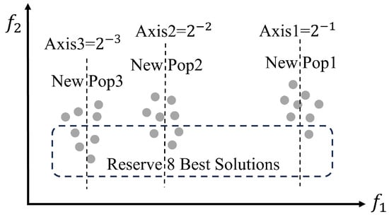 Figure 2 gives a simple example of how to compose a hybrid initial population with three other newly generated initial populations adaptively distributed in the objective space. According to Algorithm 2, the newly generated initial populations start from from the middle of the objective space, i.e., from in Figure 2. Then, using 0.5 as the exponential base, the next generated new initial population is distributed around , i.e., 0.25 or . The same goes for the third newly generated initial population, distributed around , i.e., , in the objective space. Finally, by truncating the three newly generated initial populations together into a hybrid one with the preset population size (reserving eight solutions in this example), the final hybrid initial population then not only explores more diverse genes by those adaptively distributed new initial populations across the objective space, but also exploits more elite genes through the earlier search in the forward areas of the objective space. It should also be noted that the distribution axis of each newly generated initial population in Figure 2 is controlled by the input P parameter in Algorithm 3, where a smaller P means selecting less features and a larger one means selecting more, in each newly generated solution within a population.