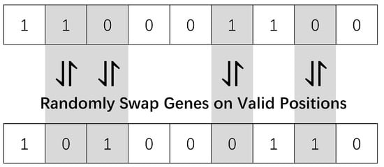 Figure 3 gives a simple example of how to conduct the effective crossover operation in reproduction. The upper and lower parts of Figure 3, respectively, show two decision vectors for parent solutions, with 1 meaning selecting that position of the feature and 0 meaning not selecting it. It can be seen from the directions and positions of the interactive arrows located in the middle of Figure 3 that only variables in the gray areas can be swapped, i.e., from 1 to 0, or from 0 to 1. These gray areas are in fact valid areas where the upper and lower variables in two decision vectors have distinct values. Thus, crossover operations within the above-introduced valid areas can be effective, as they make no invalid operations, such as swapping 0 to 0, or 1 to 1. Combining the above-introduced effective crossover with the mating and mutation operations in Algorithm 4, the reproduction process of HIER is then efficiently improved in the following three aspects: first, the mating is based on fair and random selection from the current population to bring in more diversity; second, the crossover only focuses on swapping different variables between two parent solutions in order to make valid offspring; third, the mutation adaptively adjusts the scale of variation to skip potential local optima and to help find more varied offspring.