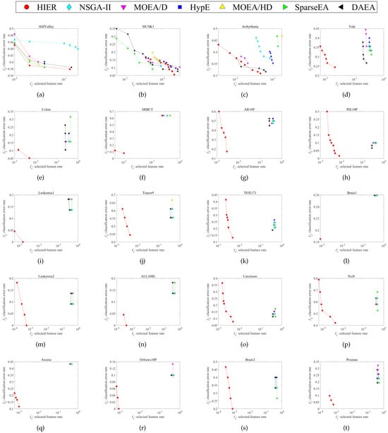 Nondominated solution distributions in terms of the Pareto curves drawn in the objective space, with the run of median HV performance on the final test data, obtained by each algorithm. (a) HillValley. (b) MUSK1. (c) Arrhythmia. (d) Yale. (e) Colon. (f) SRBCT. (g) AR10P. (h) PIE10P. (i) Leukemia1. (j) Tumor9. (k) TOX171. (l) Brain1. (m) Leukemia2. (n) ALLAML. (o) Carcinom. (p) Nci9. (q) Arcene. (r) Orlraws10P. (s) Brain2. (t) Prostate.