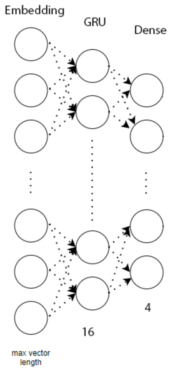 - GRU—recurrent layer of the neural network; includes 16 blocks.