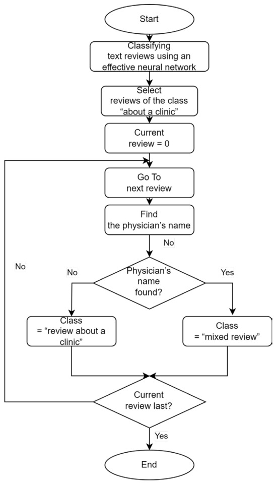 The method consists of two steps: first, we use one of the artificial neural network architectures (LSTM, CNN, or GRU) to classify the reviews into four main classes based on their sentiment and target (positive or negative, physician or clinic); second, we apply a linguistic approach to extract named entities from the reviews.