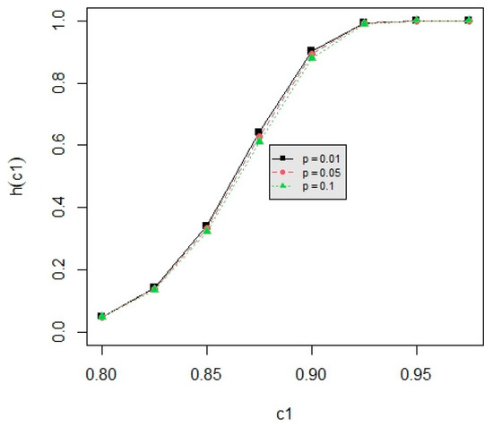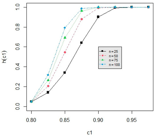 The powers h(c1) for testing are tabulated in Table A1, Table A2, Table A3, Table A4, Table A5, Table A6, Table A7, Table A8 and Table A9 for d = 2, 3, 4 with α = 0.01, 0.05, 0.1 for c1 = 0.80, 0.825, 0.85, 0.875, 0.90, 0.925, m = 5,6,7, n = 25, 50, 75 and p = 0.01, 0.05, 0.1 with L = 0.05, T = 0.5. The power values are illustrated in Figure 1, Figure 2, Figure 3, Figure 4 and Figure 5, demonstrating various standard scenarios. We have the following six findings from Table A1, Table A2, Table A3, Table A4, Table A5, Table A6, Table A7, Table A8 and Table A9 and Figure 1, Figure 2, Figure 3, Figure 4 and Figure 5. (1) From Figure 1, the power increases when d increases under n = 25, m = 5, p = 0.05 and α = 0.05. However, the difference is not significant, especially when c1 is getting closer to 1 (the same pattern is observed with alternative combinations of n, m, p, and α as well). (2) From Figure 2, the power value is an increasing function of n for fixed d = 3, α = 0.05, m = 5, and p = 0.05 (the same pattern is observed with alternative combinations of d, m, p and α as well). (3) From Figure 3, the power value is a decreasing function of m for fixed d = 3, n = 25, p = 0.05, and α = 0.05 (the same pattern is observed with alternative combinations of d, n, p, and α as well). However, the difference is not significant. Therefore, the users do not need to increase the number of inspection intervals in order to yield higher test power. (4) From Figure 4, the power increases when p increases for fixed d = 3, n = 25, m = 5, and α = 0.05 (the same pattern is observed with alternative combinations of d, n, m, and α as well). (5) From Figure 5, the power value is an increasing function of α under d = 3, n = 25, m = 5, and p = 0.05 (the same pattern is observed with alternative combinations of d, n, m, and p as well). (6) From Figure 1, Figure 2, Figure 3, Figure 4 and Figure 5, the power increases when c1 increases for any combinations of d, n, m, p, and α.