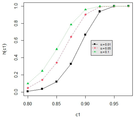 For this test, the power function h(c1) at the point of or is derived as follows: