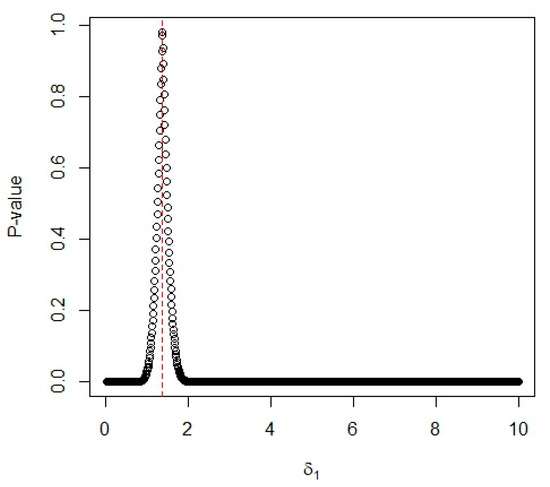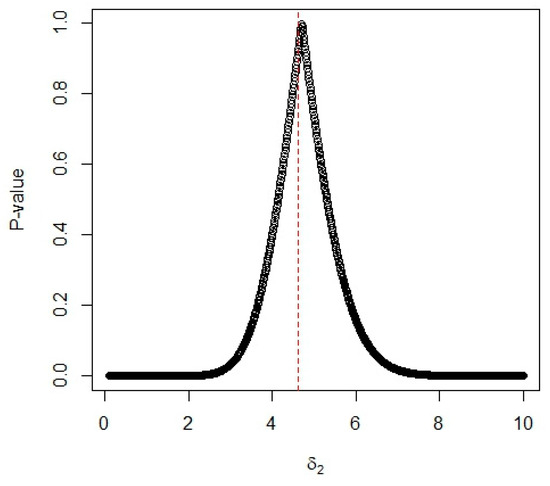 We consider a manufacturing process comprising two production lines (d = 2). For the first production line, the data in Lawless [21] is comprised of the failure times of n = 36 electrical appliances. The data of 36 failure times U1j, j = 1,…,36, is listed as follows: 0.0011, 0.0035, 0.0049, 0.017, 0.0329, 0.0381, 0.0708, 0.0958, 0.1062, 0.1167, 0.1594, 0.1925, 0.199, 0.2223, 0.2327, 0.24, 0.2451, 0.2471, 0.2551, 0.2565, 0.2568, 0.2702, 0.2761, 0.2831, 0.3034, 0.3034, 0.3059, 0.3112, 0.3214, 0.3478, 0.3504, 0.4329, 0.6367, 0.6976, 0.7846, 1.3403. We use the G test based on the Gini statistic from Gail and Gastwirth [22] to test if the data fits a Burr XII distribution or not. The p-value of this test is a function of the shape parameter δ1. From Figure 6, we can see that the maximum p-value of occurred when the value of δ1 = 1.37. The large p-value indicates that the data fits the Burr XII distribution very well. Therefore, the value of δ1 is determined as δ1 = 1.37. For the second production line, the data in Lai et al. [23] is comprised of the failure times of n = 20 components. The data of 20 failure times U2j, j = 1,…,20, is listed as follows: 0.0481, 0.1196, 0.1438, 0.1797, 0.1811, 0.1831, 0.1885, 0.2104, 0.2133, 0.2144, 0.2282, 0.2322, 0.2334, 0.2341, 0.2428, 0.2447, 0.2511, 0.2593, 0.2715, 0.3218. Using the G test, the p-value of this test is a function of the shape parameter δ2, and it is plotted in Figure 7. From Figure 7, we can see that the maximum p-value of occurred when the value of δ2 = 4.62. Likewise, the large p-value indicates that the data fits the Burr XII distribution very well. Thus, the value of δ2 is determined as δ2 = 4.62.
