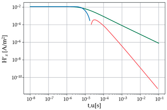 Sumudu image of the function —green line; the positive part of the function graph—blue line; the absolute value of the negative part of the function graph—red line. The distance between the centers of the loops is 100 m. The electrical conductivity of the lower half-space is 0.01 S/m.