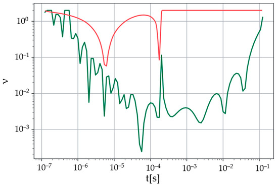 Relative error of the reconstructed function from its Laplace image. The distance between the centers of the loops is 100 m, the conductivity of the lower half-space is 0.1 S/m. Green line—noise level in the Sumudu image at , red line—at .