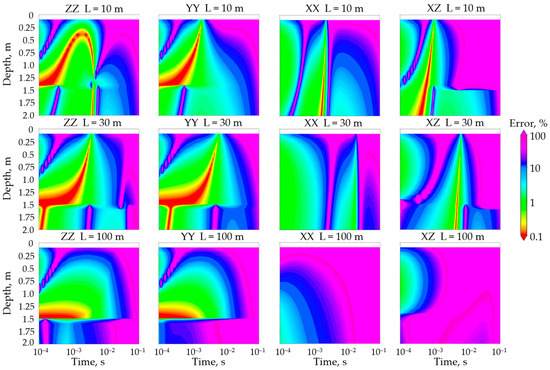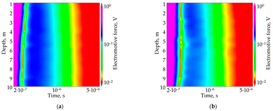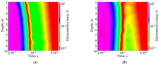 As it appears from the figures, the relative error in calculating the inverse Sumudu and Laplace transformations through the proposed method directly depends on the noise level in the original image. The lower the noise level, the smaller the error of the reconstructed function. Moreover, if the noise level is not very high, then more accurate results are obtained by inverting the Laplace transform. However, at a sufficiently high noise level, inverting the Laplace transform does not allow achieving a satisfactory result. The high level of relative error in the reconstructed functions at early times is associated with oscillations of these functions around the exact value. In order to solve the inverse problem of TEM sounding, the EMF values are required at later times—at which the level of the relative error (depending on the noise level) takes acceptable values.