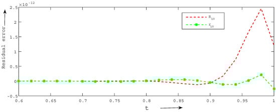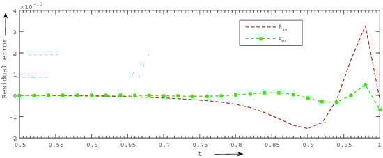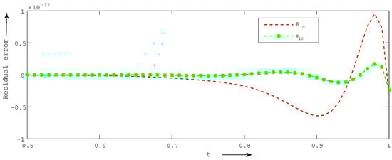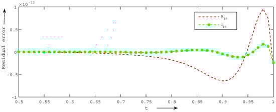 We present a comparison of errors using the and norms of the CCM with those of the BCM for and for Example 4 in Table 9. We clearly observe that achieving the desired level of accuracy is more effectively accomplished with the CCM compared to the BCM. Furthermore, Figure 4 illustrates a comparison of residual errors between the current technique and the BCM, revealing that the residual errors of the CCM are significantly lower than those of the BCM.