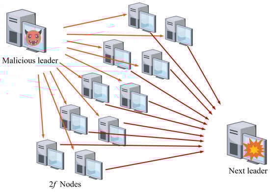 A study was based on a messages exchange, resulting in algorithms with deterministic finality [17]. The classical Byzantine Fault Tolerant algorithm (BFT) [18], proposed by Leslie Lamport et al., assumes a total number of n replicas, with f being the number of Byzantine replicas. BFT can ensure consensus among honest nodes in a Byzantine system only when . However, the voting between nodes involves substantial communication overhead, and the communication complexity of the system is . PBFT is an improvement over BFT. By employing a master–slave backup design, PBFT reduces the communication complexity of the entire system in normal states to . However, its introduced view-change process is relatively complex, and improvements can be made in terms of transaction latency and system throughput.