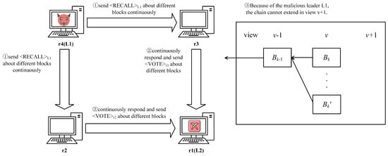 The HCA protocol introduces the concept of revoting, and while it effectively enhances the speed of block generation, it also creates certain issues. Consider the following scenario with four replica nodes, namely, , where is the leader of the current view , and is the leader of view . As shown in Figure 2, if acts maliciously, in the HCA protocol, it can continuously send messages to other replicas, urging them to revote on multiple proposals from . This malicious revoting behavior can lead to network congestion and increase system latency. We believe that the reason why this attack is successful is that replica nodes trust the recall message sent by the leader too much, while neglecting the potential for malicious behavior by the primary node. Therefore, in RHCA, we modify the format of recall messages by not including candidate proposals within them. In RHCA, upon receiving a recall message, replica nodes invoke to obtain a globally consistent proposal . Honest replicas subsequently compare with the proposal they voted for in the previous round. If is deemed fresher, the replicas send votes for the proposal . Consequently, in RHCA, revoting can only be conducted entirely once in a view, thus addressing the issue of malicious primary nodes exploiting revoting for attacks.