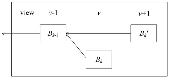For a primary node in view v, within this view, either primary node does nothing or proposes a block. If it is the former, each replica waits for the proposed message from leader until the local timer times out. Eventually, each replica sends a vote message for the previous block (i.e., ) to the next view’s primary node . If it is the latter, primary node collects vote messages from each replica and proposes a new block. Assuming the height of this block is k, we use to represent the proposed block. For the primary node in view , by Lemma 1, can only collect votes for blocks with heights or k, i.e., and . If proposes a new block after , a fork will occur in the blockchain, as shown in Figure 3. and are at the same height, but the view number of is greater than that of .