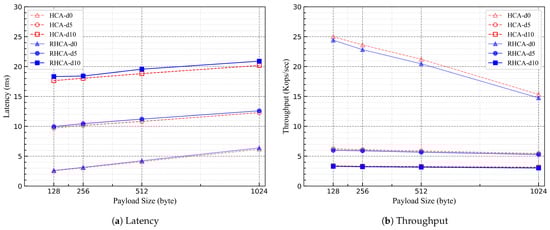 In Figure 7, we set the network latency to 0 and set the size of the request payload to 128 bytes and 1024 bytes, respectively, for the experiment. The results indicate that as the number of nodes increases, the consensus latency of both RHCA and HCA gradually increases, while the request throughput gradually decreases. Additionally, with a payload size of 1024 bytes, the performance of RHCA and HCA deteriorates more rapidly as the number of nodes increases.