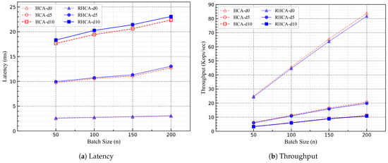 In addition, we also varied the batch size for multiple experiments and observed how the performance of RHCA and HCA changed. Figure 5a illustrates the consensus latency in milliseconds, while Figure 5b displays the request throughput in thousand operations per second. Figure 5 indicates that as the batch size increases, the consensus latency of both RHCA and HCA slightly increases, while the request throughput has a significant improvement relatively. For example, in the scenarios where the simulated network delay was 5 ms, the throughput of the RHCA protocol tripled when the batch size increased from 50 to 200, while the consensus latency only increased by approximately one-third. This suggests that in practical scenarios, as long as the consensus latency remains within an acceptable range, effectively enhancing the request throughput of the RHCA protocol can be achieved by appropriately increasing the batch size.