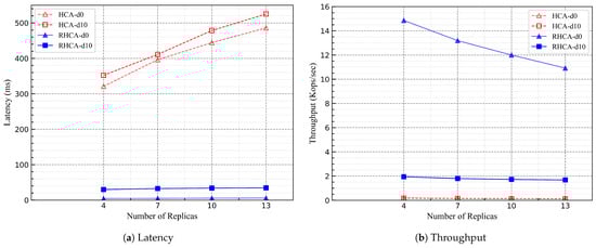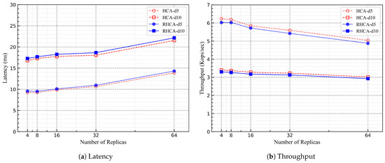 In Figure 6, we used the traffic control tool to simulate network delays, setting network delays to 5 ms and 10 ms to run the blockchain network. The experimental results indicate that as the number of nodes increases, the performance trends of RHCA and HCA are similar. Both RHCA and HCA exhibit a slight increase in consensus latency, and the request throughput slightly decreases.