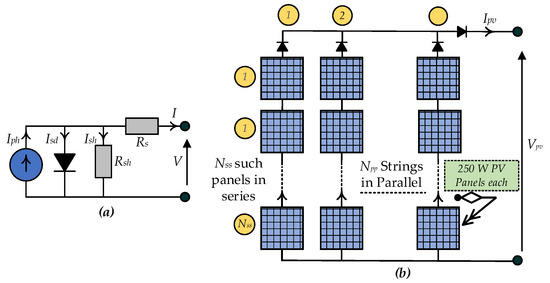 To meet the power requirements, the PV generator consists of a set of panels in series with a set of panels in parallel. Therefore, the characteristic equation of a PV generator is given in Equation (3)