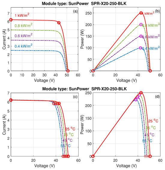 The current versus voltage (V-I) and power versus voltage (P-V) characteristics depend essentially on the irradiance and temperature of the photovoltaic generator. This dependence is shown in Figure 3. Clearly, a change in irradiance, Figure 3a,b, and temperature, Figure 3c,d, results in a change in the maximum power point, which deviates from its location as meteorological conditions change.