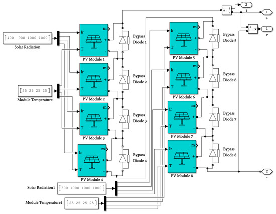 Herein, is the photocurrent generated, is the diode reverse saturation current, is the number of cells connected in series, is the shunt resistor, is the series resistor and is the temperature voltage given by Equation (2), where is the diode ideality factor, k is Boltzmann’s constant, T is the temperature of the P-N junction, and q is the charge of an electron.