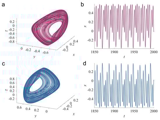 Upon closer examination of System (1), it becomes evident that, owing to its exclusively quadratic terms, the system remains unaltered when subjected to the transformation . Hence, while structural symmetry cannot be identified in System (1), it is worth noting that this system displays a symmetrical strange repeller. This symmetry is established because the time-reversed system reveals a chaotic solution that exhibits symmetry with respect to the original system’s strange attractor, particularly around the origin. The trajectory within the three-dimensional state space and the time series of variable of this symmetrical strange repeller are depicted in Figure 1c,d.