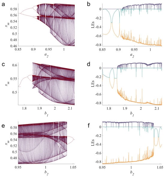 The dynamical characteristics of System (1) regarding the variation of the parameters (a,b) within , (c,d) within , and (e,f) within in terms of forward (shown in blue) and backward (shown in red) bifurcation diagrams in the left columns and forward/backward LE spectra in the right columns. Other settings are the same as in Figure 1. With the forward and backward diagrams overlapping, there is no evidence of multistability emerging from variations in the parameters.