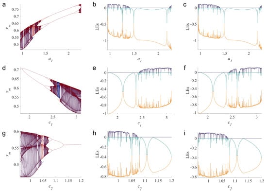 The dynamical characteristics of System (1) regarding the variation of the parameters (within ; first column), (within ; second column), and (within ; third column) while in terms of (a–c) forward (shown in blue) and backward (shown in red) bifurcation diagrams and (d–f) forward and (g–i) backward LE spectra. Other settings are the same as in Figure 1. In each case, the forward and backward diagrams do not exhibit congruence in specific ranges of bifurcation parameters, signifying the presence of multistability in the corresponding parameter region.