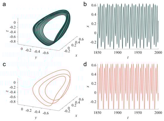 The dynamical properties of System (1) in terms of (a,c) phase portrait in state space and (b,d) time series of the variable . System (1) is solved for , , and while initialized with the initial conditions and to obtain the chaotic (shown in green) and period-3 (shown in orange) solutions, respectively. After elapsing a significant transient time, the system demonstrates multistability, where chaotic and periodic attractors coexist.