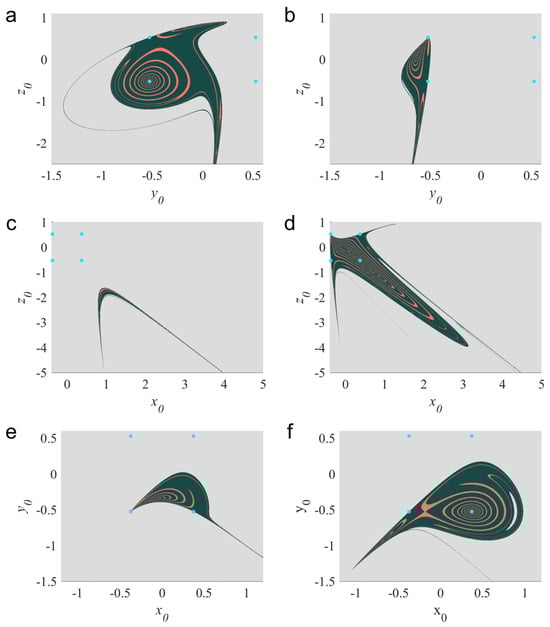 The study of the basin of attraction for a dynamical system becomes even more interesting in the case of multistability. Hence, keeping , , and , we aimed to find the initial variable settings leading to the chaotic and periodic attractors illustrated in Figure 4. Accordingly, Figure 5 portrays six cross-sectional views of the three-dimensional state space, facilitating the recognition of the eight system equilibria. These cross sections are (Figure 5a,b), (Figure 5c,d), and (Figure 5e,f) planes. As portrayed in Figure 5, the system equilibria have no basin of attractions. As illustrated in Figure 5, it is evident that the system’s equilibria do not possess basins of attraction. Consequently, in the parameter settings being considered, these equilibria are proven unstable without further analytical analysis. The instability of these equilibria can also be confirmed through the stability analysis described in Section 3.1, as none of the system’s equilibria exhibit three negative real eigenvalues. The regions highlighted in green and orange represent the initial conditions resulting in the chaotic and periodic solutions already depicted in Figure 4. Furthermore, Figure 5 illustrates a considerable portion of unbounded orbits, signifying that the system is likely to exhibit unbounded behavior. Nevertheless, in specific regions, it can follow distinct trajectories with a bounded nature.