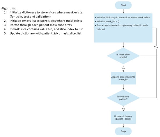 - The model training in the pipeline requires tumor labels, i.e., masks to be assigned to each slice. The slices without masks are filtered out from the training. Another algorithm is designed to identify which slices of each patient have associated masks. The indexes of such slices with masks are sorted out for each patient.