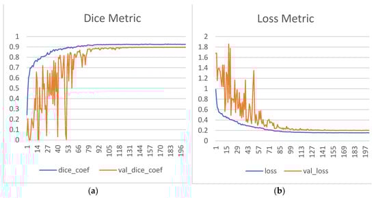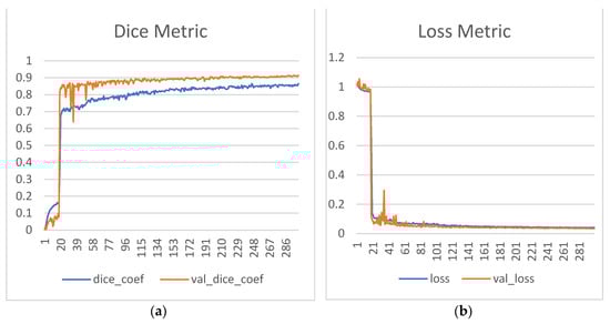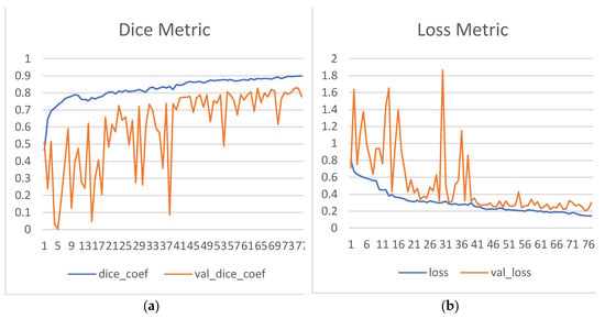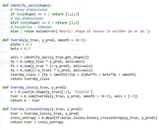- For the U-Net architecture in the developed pipeline, a hybrid Tversky–cross-entropy loss function is utilized, which combines the advantages of the binary cross-entropy (BCE) loss function and the Tversky focal loss. A Nesterov-accelerated adaptive moment estimation (Nadam) optimization algorithm is leveraged to achieve better optimization performance.