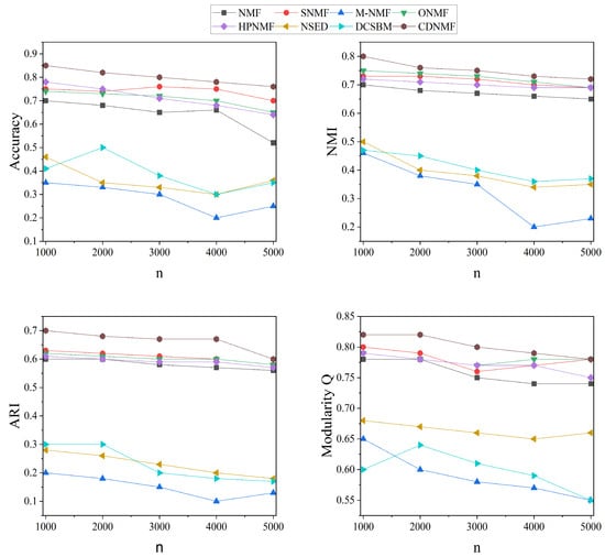 The data shown in Table 4 demonstrate that when the confusion factor increases, the community structure of the network becomes less transparent, and it becomes more challenging to locate existing communities. The approach that is discussed in this work, CDNMF, performs better on all of the methods, despite the fact that the performance of each method decreases more significantly as a consequence of this. As an illustration, when the value of mu is equal to 0.1, CDNMF exhibits significant improvements in ACC, NMI, ARI, and modularity Q of 7.7%, 3.1%, 8.2%, and 2.4%, respectively, in comparison to SNMF, which is the most effective community detection algorithm based on NMF. In addition, CDNMF demonstrates varying degrees of improvement across the four assessment measures when applied to several distinct datasets. The results of the experiments carried out on the second set of synthetic networks are shown in Figure 1. In this figure, it is also possible to observe that CDNMF achieves the highest level of performance across all networks, regardless of the number of nodes present.
