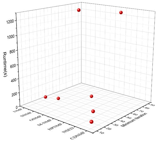 In the analysis described in this section, the real network Pubmed was chosen as the experimental data, and the NMF-based community detection methods NMF, SNMF, M-NMF, ONMF, HPNMF, and NSED were chosen for comparison. The purpose of this experiment was to investigate the minimum number of iterations required for CDNMF to achieve the best community delineation results. The minimum number of iterations, denoted by , and the time required for each approach to achieve the best possible results in terms of community delineation were evaluated and documented.