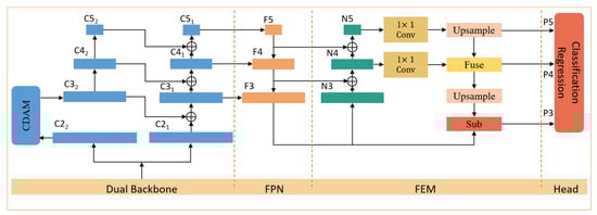The architecture of the proposed method. Firstly, a composite backbone network is designed for extracting features. Backbone1 uses a basic backbone network, while Backbone2 adds the CDAM after the feature layer in order to introduce context information; the rest of the network is the same as Backbone1. The composite backbone outputs three layers, F3, F4, and F5; the FEM is used to highlight features of small objects. Finally, P3, P4, and P5 are sent for further classification and regression.