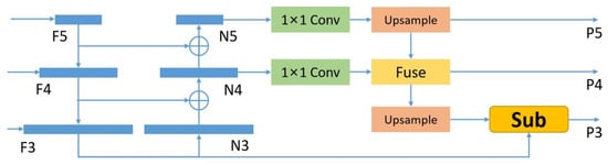 N3 is the shallow layer encompassing objects of all sizes. In order to retain the features of small objects, it is essential to suppress the features of objects of other sizes. By processing N4 and N5 according to the following formula, this model can obtain the feature layer that suppresses small object features and highlights medium and large object features, denoted as .
