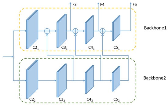 Based on the above composite backbone structure, the two backbone networks extract features in different ways and then fuse them, enriching the object feature information and improving small object detection accuracy. Figure 5 describes the entire procedure.