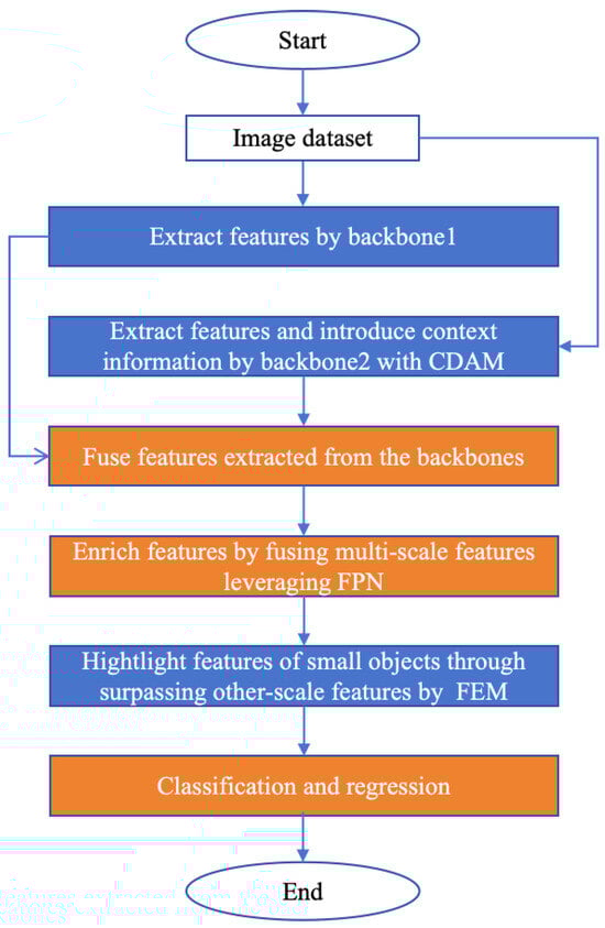 The primary objective aims at improving detection ability for small objects by integrating context information, extracting more comprehensive features, and suppressing the impact of medium and large objects. To accomplish this, this work presents a novel small object detection model that integrates several crucial components. Firstly, the CDAM is introduced, which facilitates the comprehensive capture of context information. The module utilizes surrounding context and enhances the detection process. Secondly, the FEM is proposed, specifically designed to suppress the impact of medium and large object features. By focusing on small object detection, the FEM effectively eliminates the interference caused by larger objects and better detects small targets. Lastly, composite backbone networks are incorporated into our framework to enable more extensive and robust feature extraction. This integration of diverse backbone networks ensures the comprehensive representation of various object characteristics and enhances the overall detection performance. The architecture of the proposed method is illustrated in Figure 1.