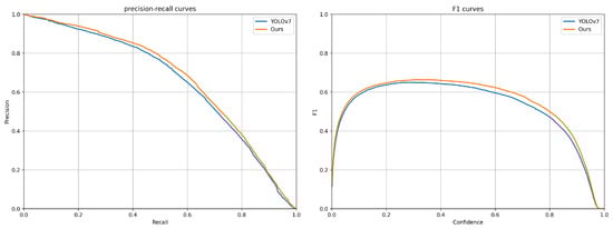 Compared with the baseline, our method demonstrates a notable enhancement when detecting small objects, with a 2.6% increase in . In the detection of large objects, our method performs roughly on par with the baseline. This evidence confirms that our approach provides a notable enhancement in small object detection. The overall improvements in AP and AR also demonstrate the effectiveness of the proposed method. Figure 7 shows precision-recall curves and F1 curves.