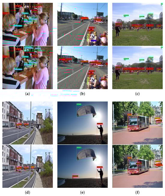 First, this work conducts some ablation studies in order to validate the efficiency of the CDAM. Table 2 shows the outcome. Compared to the baseline, the inclusion of the composite dilated convolution shows an improvement of 0.6% in detecting accuracy, while incorporating the CBAM results in an additional improvement of 0.3%. Moreover, with the introduction of the CDAM, while increase, there are corresponding improvements in and , rising by 2.2% and 3%, respectively. The above results conclusively demonstrate the efficacy of the CDAM, as well as the effectiveness of the composite dilated convolution. These enhancements not only enable the model to leverage context information more effectively but also strengthen its precise focus on crucial regions, providing clear evidence for the improvement in object detection performance across various object sizes.