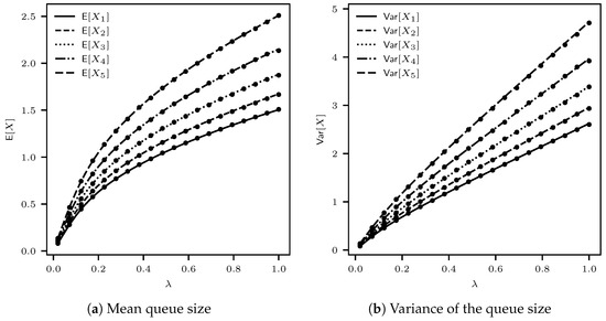 We first consider a synchronisation station with five queues, with equal arrival rates in all queues and with capacities , , , and . The abandonment rates in the different queues equal , , , , and . Here, is a scale factor for the abandonment rates. This factor can be used to study how the abandonment rates affect performance, with higher corresponding to more abandonments. With these queue capacities, there are approximately states. Figure 1a,b depict the mean and variance of the queue sizes versus the arrival rate , respectively. The scale parameter is fixed to for all curves. The different curves are calculated by applying the -algorithm on the 30th-order series expansion. Not all terms in the series expansion are necessarily used though, the expansion order being an upper bound for the number of terms in the stopping rule of [31]. The markers were obtained by means of stochastic simulation and are included to verify the accuracy of the series expansion approach. The simulation results were obtained by means of the replication–deletion approach. We simulated 100 replications of 5 × state transitions. The obtained confidence intervals are smaller than of the simulated value and are, therefore, omitted from the plots. The figures show that the correspondence between the simulation results and the series expansion approach is excellent for the complete range of the -values. We would like to point out that the -algorithm is key for the accuracy of the results. Without convergence acceleration, the region of convergence of the series expansion is limited, and the results are only accurate for very small arrival rates (). We excluded the curves without acceleration from the figures to enhance clarity.