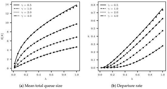 To evaluate the effect of the abandonment rates on performance, Figure 2 depicts the mean total queue content and the departure rate from the queues vs. the arrival rate for different values of the scale factor , as indicated. Again, values from the (30th-order) series expansion approach were compared with the equivalent values obtained by stochastic simulation. As in Figure 1, the simulation results were obtained by means of the replication–deletion approach with 100 replications of 5 × state transitions. The simulation study showed that the combination of the series expansion approach and the -algorithm leads to very accurate results. More arrivals translate into larger queue sizes, while more abandonments imply lower queue sizes. Analogously, the departure rate increases with the arrival rate and decreases with the abandonment rate. Recall that the departure rate only includes departures by synchronisation and excludes departures by abandonments. Ideally, the departure rate should equal the arrival rate, so that all arrivals can leave the queues by synchronisation. There are two impediments to such a perfect operation of the synchronisation station. First, some part arrivals may not enter the synchronisation station due to a lack of queue capacity. Secondly, parts may be abandoned, prior to synchronisation. The latter effect is dominant in the present example, especially for higher abandonment rates (that is, for higher ).