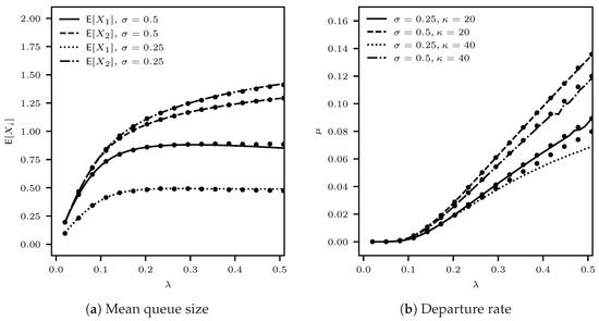 Figure 3a shows the mean queue size as a function of the arrival rate for different values of and fixed . Only the mean queue size of the first two queues is shown. Due to symmetry, the mean queue size of the remaining queues is identical to the mean queue size of the second queue. The curves were obtained by the 80th-order series expansion approach, complemented with the -algorithm. The markers again represent stochastic simulation results. The simulation results were obtained by means of the replication–deletion approach with 100 replications of state transitions. The upper and lower bounds of the obtained confidence intervals are visually indiscernible and, therefore, omitted. The correspondence between the analytic and simulation results is again good, though, by the additional complexity of the environment, a higher order expansion is needed to obtain accurate results. Recall that the arrivals in queue 1 are more concentrated in time for lower values of . This leads to a lower mean queue size for the first queue and a higher mean queue size for the second queue. The concentration of arrivals leads to considerable loss in the first queue, followed by periods without arrivals. The loss explains why there are fewer parts in this queue on average. On the other hand, the absence of parts in the first queue implies that there are fewer synchronised departures, which, in turn, means that there are more parts in the other queues. This latter observation is confirmed by Figure 3b, which shows the departure rate for different and . Both an increase of and a decrease lead to a decrease of the departure rate. Also, Figure 3b compares the analytic results (80th-order expansion) with the simulation results. In contrast to the preceding figures, the accuracy is not as good, especially for and , which is the example where the arrivals are concentrated over long periods, followed by long periods without arrivals.