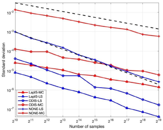 - Using a randomly shifted lattice rule with importance sampling, the error convergence order becomes close to . The fitting result obtained in the example case is approximately ;