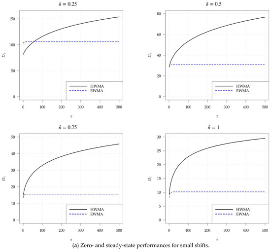 The performance of a chart can be evaluated using the characteristics of the run-length distribution such as the the standard deviation of the run-length (), the median run-length (), etc. The most popular performance measure is the . This measure represents the average number of charting statistics to be plotted on a chart before the first OOC signal is observed. The run-length characteristics are often investigated using two different modes, namely, the zero- and steady-state modes; see, e.g., Ref. [44]. The zero- and steady-state run-length modes are used to investigate the short-term and the long-term run-length properties of a chart, respectively. The zero-state run-length is defined as the number of samples at which the chart first signals given that it begins in some specific initial state. However, the steady-state run-length is the number of samples at which the chart first signals given that the process begins and stays IC for a long period, and then at some random time, an OOC is observed; see, e.g., Refs. [44,45].